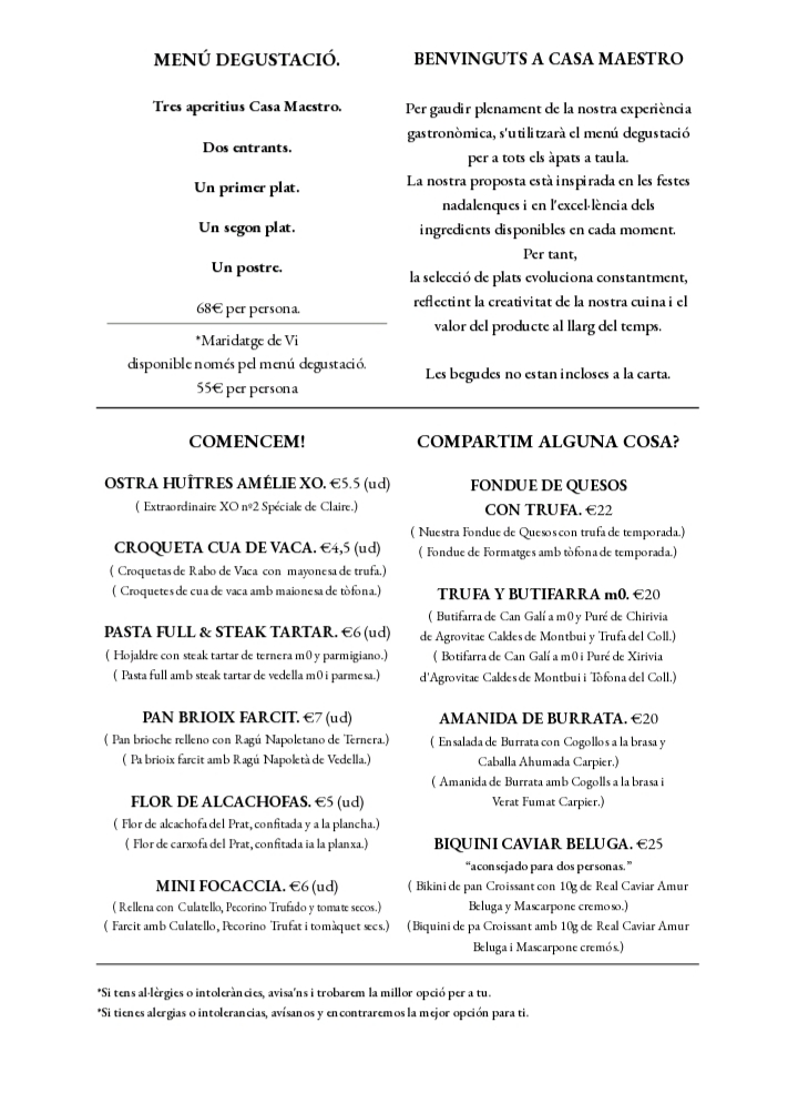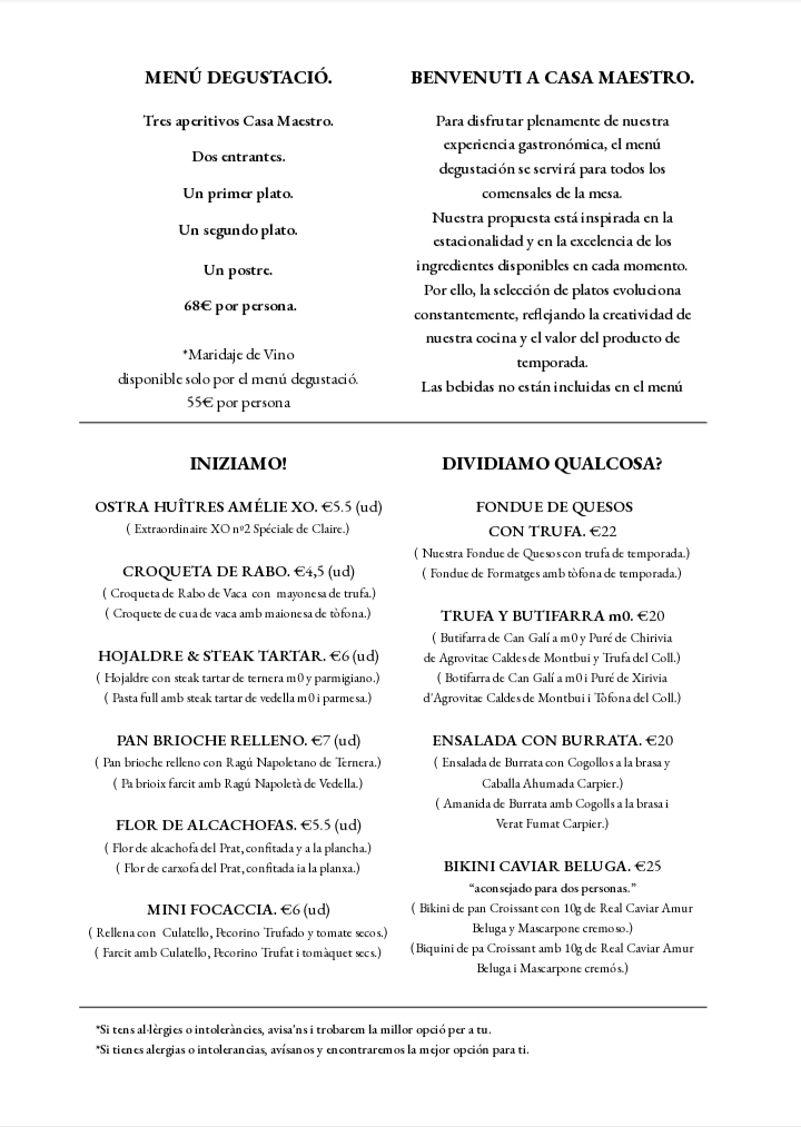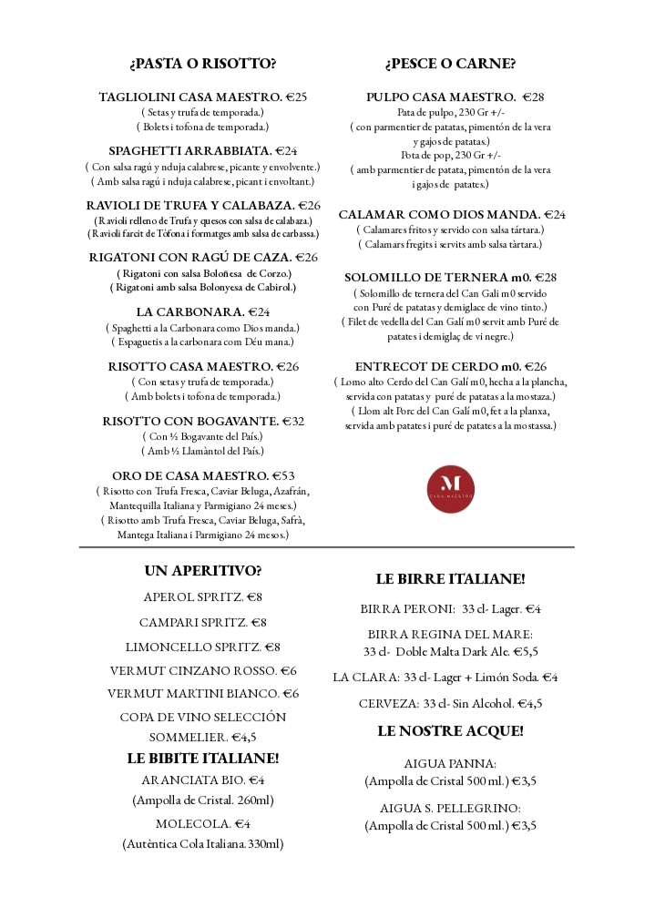 Ubicado en Castellterçol, Barcelona, Casa Maestro es un bistró italiano familiar que fusiona la tradición gastronómica de Italia con productos locales y una visión contemporánea. Nuestra cocina refleja el equilibrio entre sencillez y sofisticación, destacando ingredientes de calidad y técnicas refinadas.